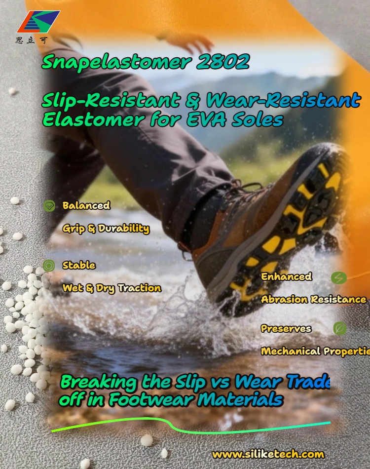 Minangka aditif anti-slip lan anti-abrasi fungsi ganda, Snapelastomer 2802 ningkatake kinerja traksi lan tahan abrasi ing sol EVA kanthi signifikan, saengga sepatu bisa luwih aman lan awet.